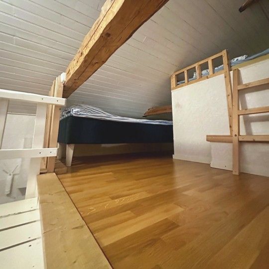 Majoitustilaa on kolmelle aikuiselle. Huomioithan parvelle vievät portaat ja kattoparrun kulkureitillä.